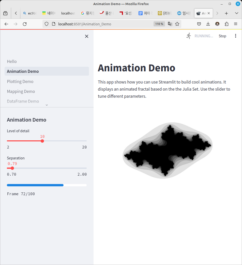 아래이미지는 스트림릿을 사용하여 줄리아 집합에 기반한 애니메이션을 만드는 과정을 보여줍니다. 사용자는 슬라이더를 조정하여 애니메이션의 세부 수준과 분리도를 조절할 수 있습니다. 이는 복잡한 수학적 개념을 시각화하고 교육적으로 사용될 수 있는 훌륭한 예입니다.