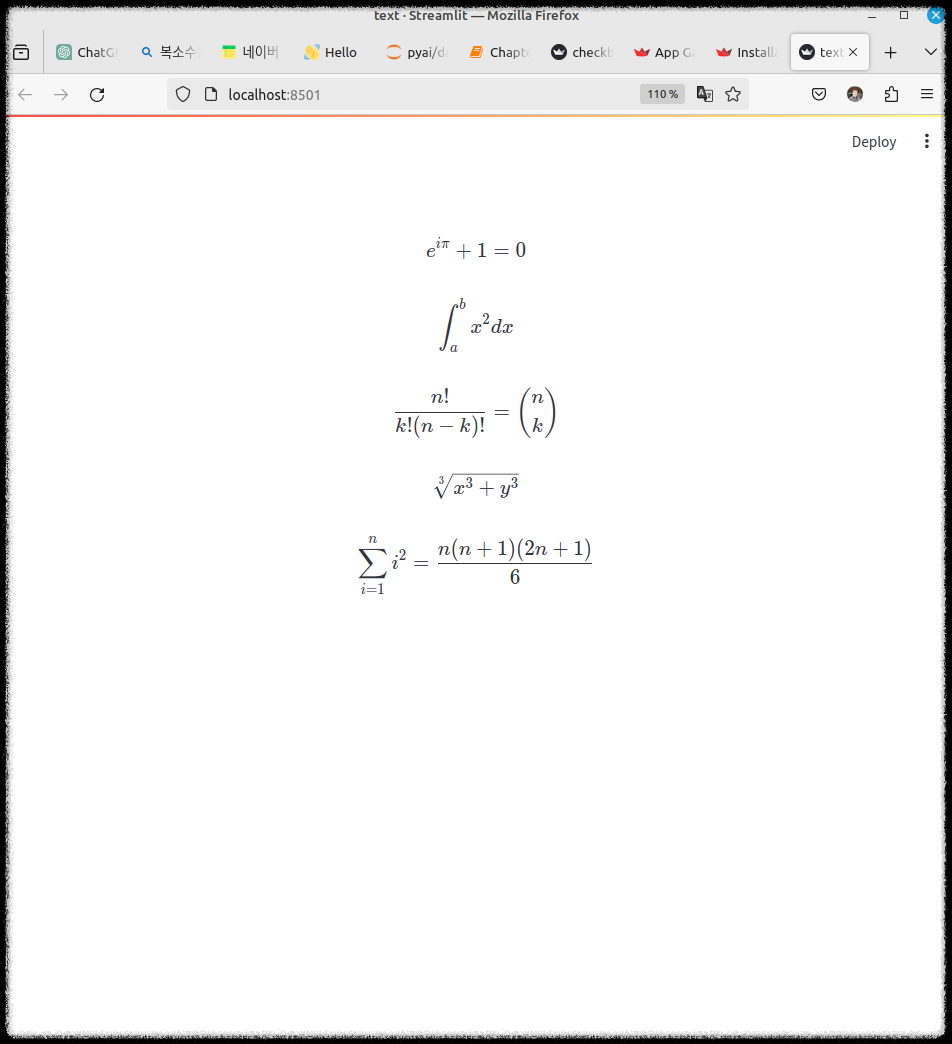 이 예제들은 스트림릿 앱에서 오일러 공식, 적분, 분수 및 루트, 그리고 합 기호를 포함한 수학적 표현을 어떻게 시각적으로 표현할 수 있는지 보여줍니다. LaTeX 문법을 사용하면 복잡한 수학 공식도 명확하고 정확하게 웹 애플리케이션에 표현할 수 있습니다.