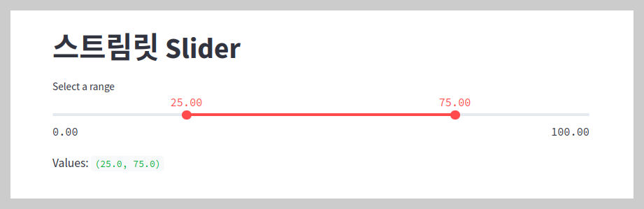 st.slider 함수는 값을 선택하기 위한 슬라이더를 생성합니다. 슬라이더는 숫자 범위를 가지며, 사용자는 이 범위 내에서 값을 선택할 수 있습니다.