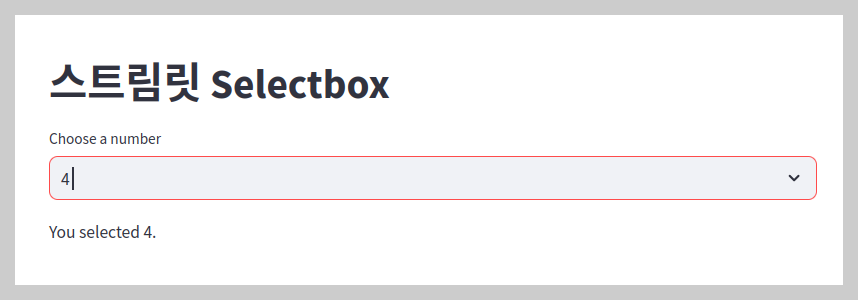 st.selectbox 함수는 드롭다운 메뉴를 생성합니다. 사용자는 제공된 옵션 중 하나를 선택할 수 있습니다.