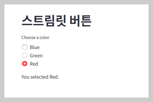 st.radio 함수는 일련의 라디오 버튼을 생성합니다. 라디오 버튼은 여러 옵션 중 하나를 선택할 수 있게 합니다.