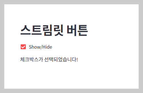 st.checkbox 함수는 선택할 수 있는 체크박스를 생성합니다. 체크박스가 선택되면 True를 반환합니다.