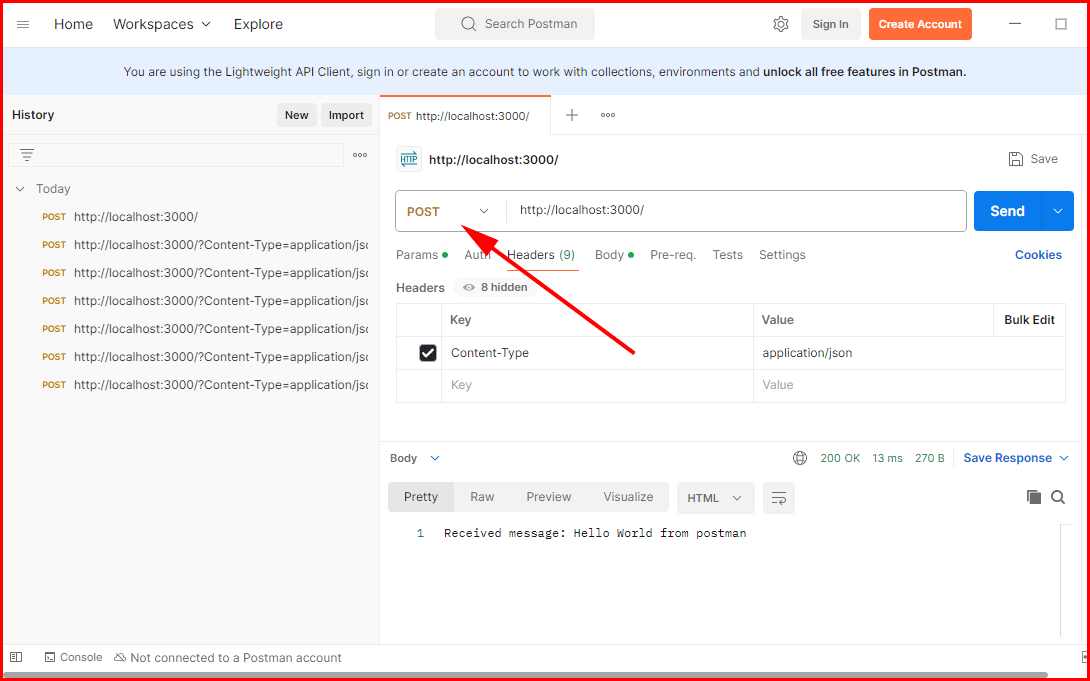 POST http://localhost:3000/ Content-Type: application/json { "message": "Hello World" }