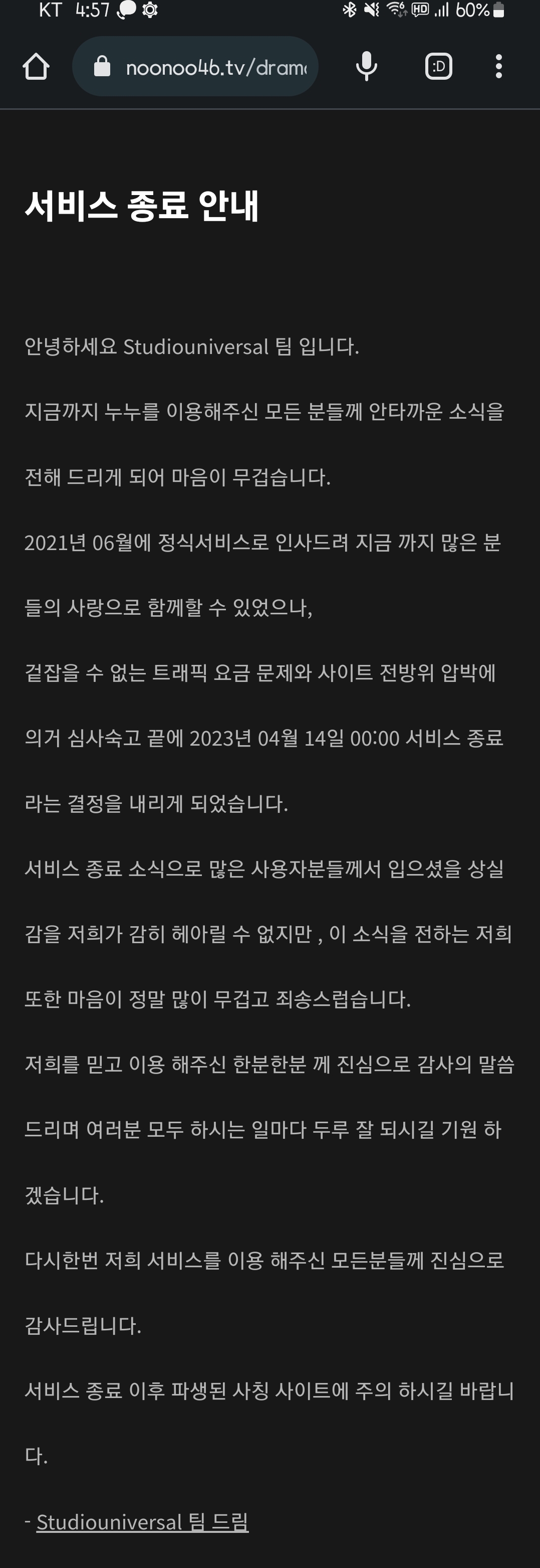 그동안 무료로 즐길 수 있어 즐겨 들렸다. 광고 방해도 없고, 로그인하라는 부담도 안 주고. 게다가 온갖 매체 콘텐츠를 몽땅 보여주니 안 들릴 수 없던 사이트였다. 매번 주소를 바꿔 가면서 연명하던 '누누'가 결국 '서비스 종료 안내' 배너를 걸었다. 오늘 0시부로.
