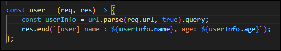 변경된 user() 함수는 쿼리 스트링 데이터를 userInfo 변수에 할당하여 그 값을 받아 표현하는 것입니다. 쿼리 스트링이란 HTTP 요청을 보낼 때 사용자가 원하는 값을 보내는 방식입니다. 경로값 뒤에 ?를 붙인 다음 key=value 형식으로 사용합니다. 쿼리 스트링이 여러 개일 경우는 &로 추가합니다.