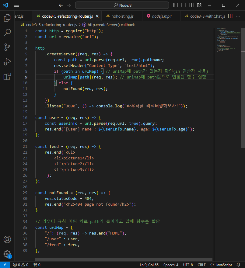 패스에서 /user 요청을 처리하는 코드를 user() 함수로, /feed 요청을 처리하는 코드를 feed() 함수로 분리합니다. 또한 패스가 없을 때나 틀린 경우는 notFound() 함수로 분리합니다.
