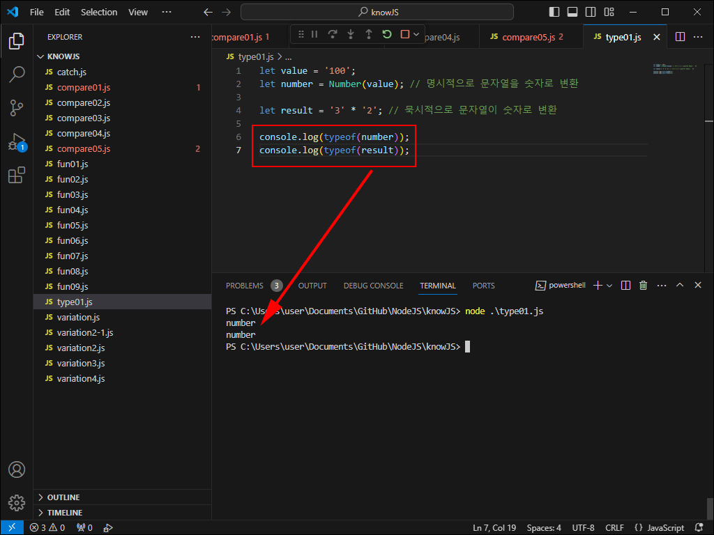 ==(동등 연산자)는 값이 같은지 비교하기 전에 두 변수를 같은 타입으로 변환합니다.===(일치 연산자)는 타입 변환 없이 값을 비교합니다. '2' == 2; // true, 문자열 '2'가 숫자 2로 암시적 변환됩니다. '2' === 2; // false, 타입이 다르기 때문에 변환 없이 비교합니다.