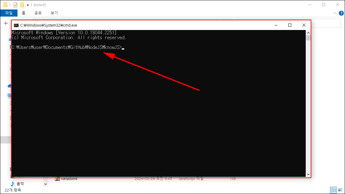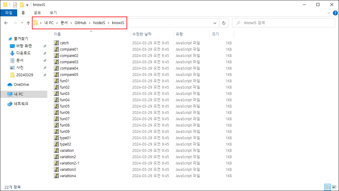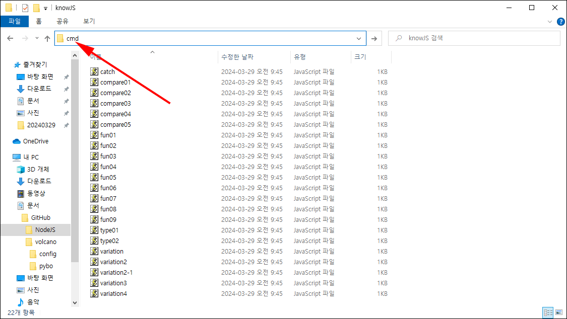 탐색창을 이용하여 해당 폴더로 이동합니다. 주소창의 경로는 ' Breadcrumbs' 형식으로 표시됩니다. 이 방식은 현재 사용자가 있는 디렉터리의 계층 구조를 시각적으로 보여주고, 각 부분을 클릭하여 빠르게 상위 폴더로 이동할 수 있게 해 줍니다. '내 PC > 문서 > GitHub > NodeJS > knowJS'라는 경로가 이 방식으로 표현된 것입니다. 사용자는 이 경로의 각 부분을 클릭하여 해당 폴더로 즉시 이동할 수 있습니다.