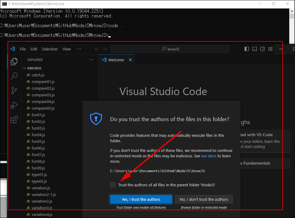 VSCode는 프로젝트 디렉터리에서 폴더를 열어서 작업하기 때문에 실행 자체를 해당 폴더로 진입해서 프로그램을 시키는 것이 의미가 있습니다. 해당 디렉터리 변경은 탐색기를 통해 진행하는 것이 쉽습니다.