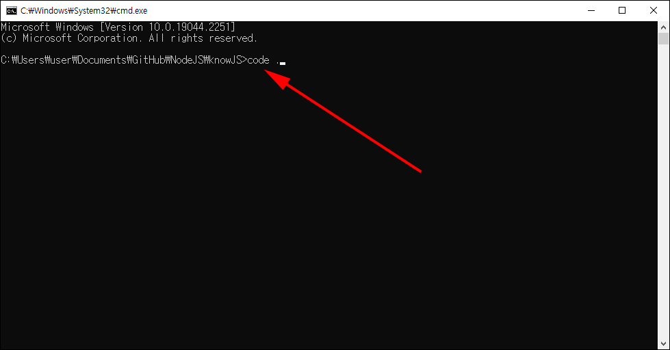여기서의 명령어는 'code .'입니다. VSCode 실행 명령인데, '.'은 현 디렉터리에서 실행을 시켜달라는 위치 정보입니다. '.'은 현재 디렉터리, '..'은 상위 디렉터리를 의미합니다.