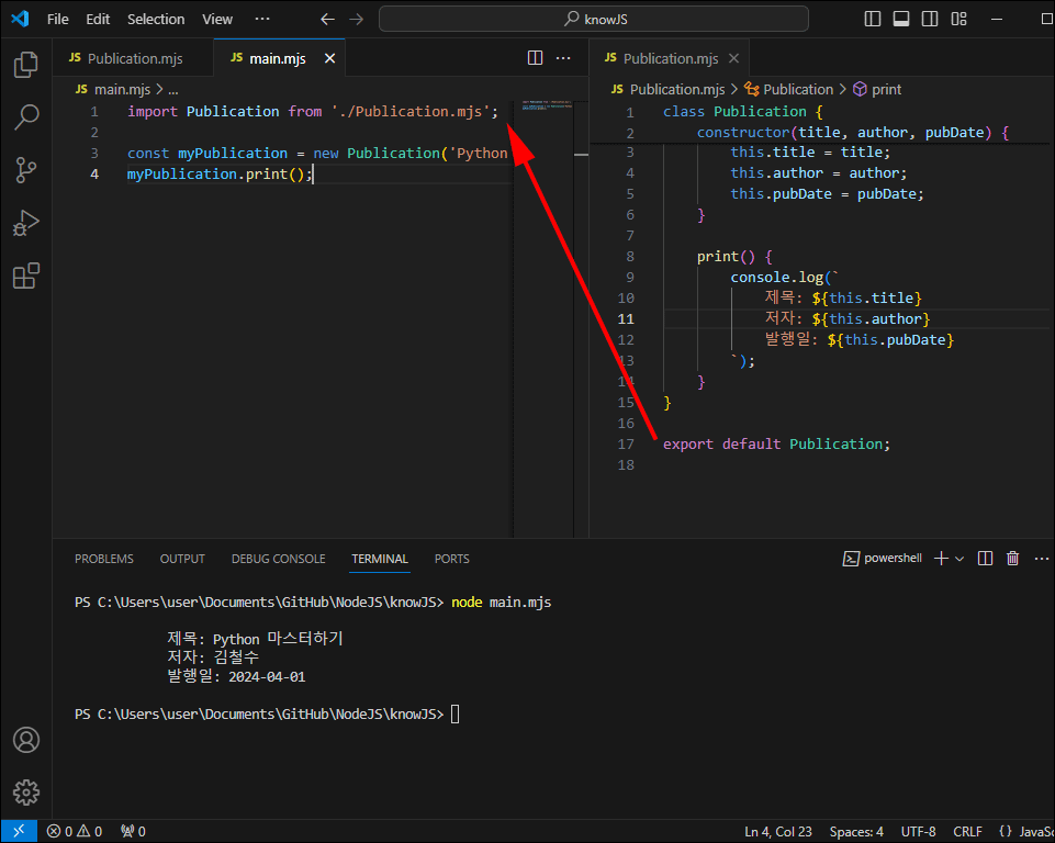 main.mjs 파일에서 클래스를 가져와 객체를 생성하고 print 메서드를 호출해 보겠습니다.