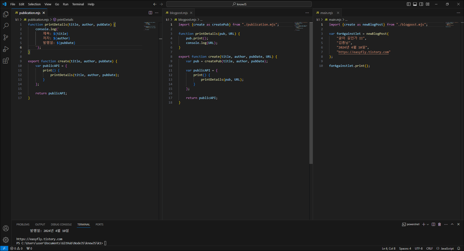 publication.mjs모듈을 확장하여 블로그 포스트 관련 기능을 추가합니다. createPub함수는publication.mjs에서 가져온create함수를 이용하여 블로그 포스트 객체를 만듭니다.printDetails함수(이름이publication.mjs에 있는 함수와 같지만, 별개의 함수임)는 블로그 포스트 객체의 정보와 URL을 출력합니다.create함수는publication모듈의create함수를 활용하여pub객체를 생성하고, 블로그 포스트에 특화된print메소드를 포함한publicAPI객체를 반환합니다.