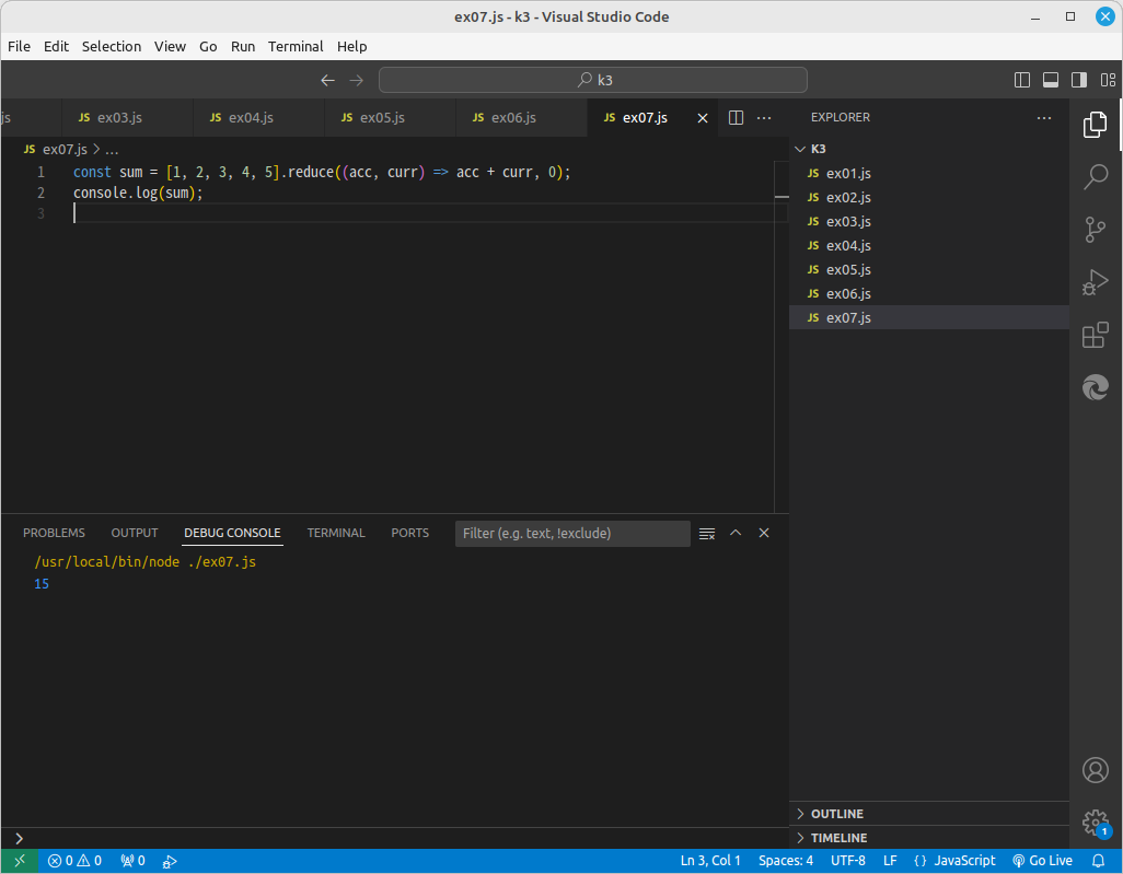 코드 실행 결과, 콘솔에는 배열의 모든 숫자의 합인 15가 출력되는 것을 볼 수 있습니다. 이는 1 + 2 + 3 + 4 + 5의 계산 결과입니다.