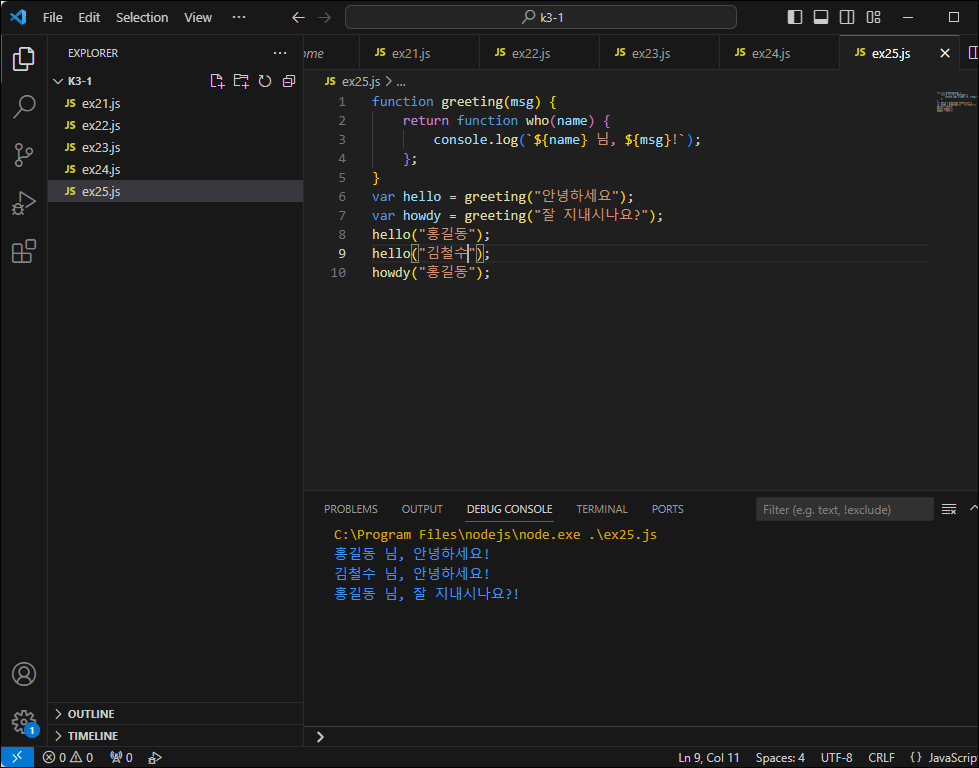 greeting 함수는 메시지를 인자로 받아, who라는 내부 함수를 반환합니다. who 함수는 또 다른 인자 name을 받고, greeting 함수의 인자와 함께 콘솔에 인사말을 출력합니다. 이때 who 함수는 greeting 함수의 스코프에 있는 msg 변수에 접근합니다.