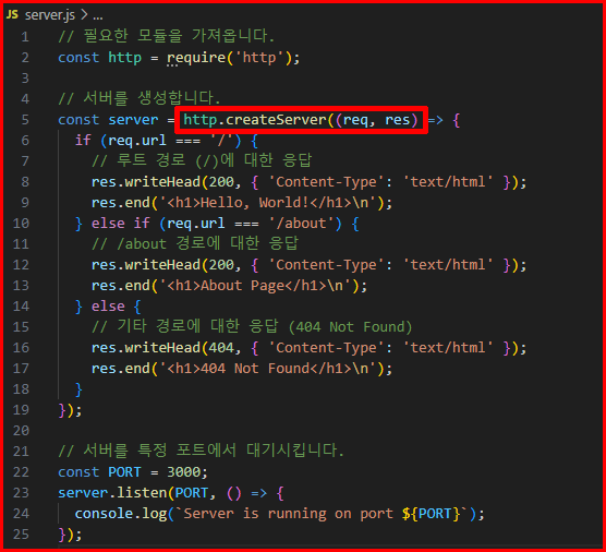 http.createServer함수는 HTTP 서버 객체를 생성합니다. 이 함수는 클라이언트로부터의 요청을 처리할 콜백 함수를 인자로 받습니다. 서버 객체는 클라이언트의 요청을 수신하고, 응답을 제공하는 역할을 합니다. 생성된 서버 객체는listen메서드를 호출하여 특정 포트에서 요청을 대기합니다.