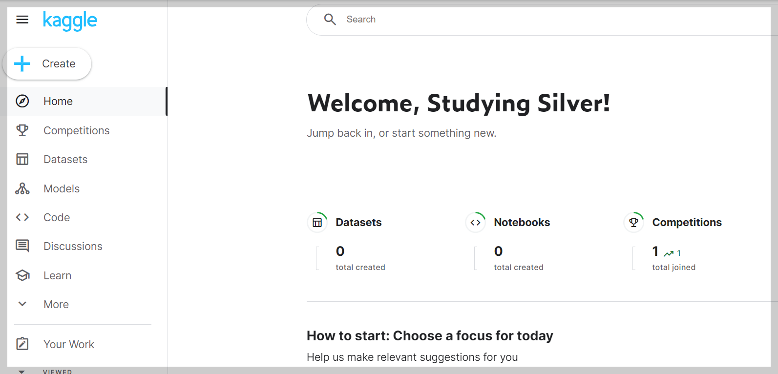 - Kaggle에 가입하여 프로필을 설정합니다. 자신의 관심 분야와 스킬을 등록하고, 커뮤니티 활동을 통해 포인트와 메달을 얻을 수 있습니다.