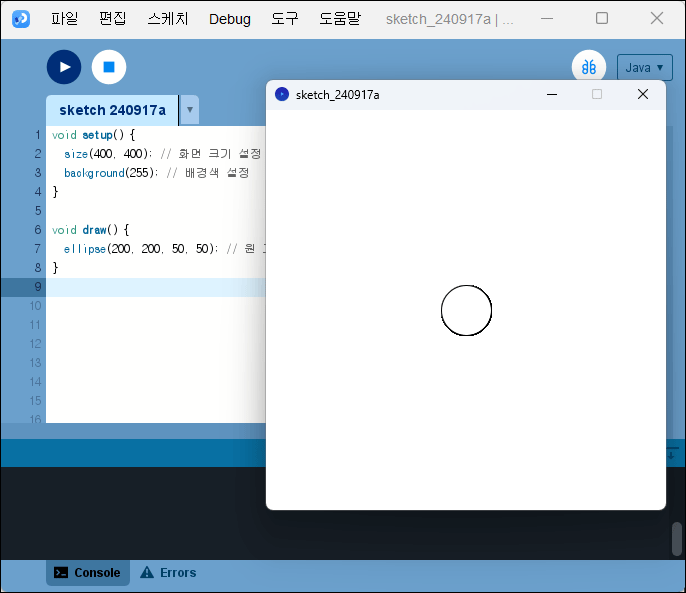 이 코드는 400x400 픽셀의 화면에 배경을 흰색으로 설정하고, 중심에 50x50 픽셀 크기의 원을 그립니다. setup() 함수는 화면 크기와 배경을 설정하는 데 사용되고, draw() 함수는 원을 계속 그리게 됩니다.