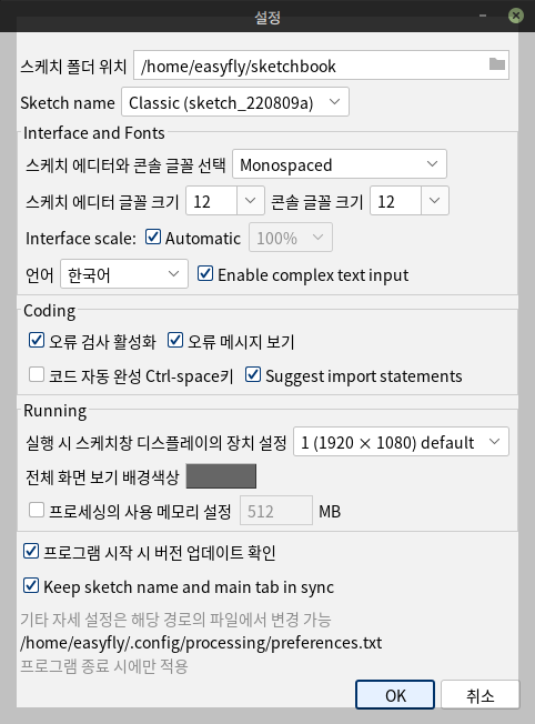 File > Preferences(Windows) 또는Processing > Preferences(macOS)를 선택하여 설정 창을 엽니다. - 여기에서 스케치북 위치, 에디터 설정, 디버그 모드 등의 옵션을 설정할 수 있습니다.