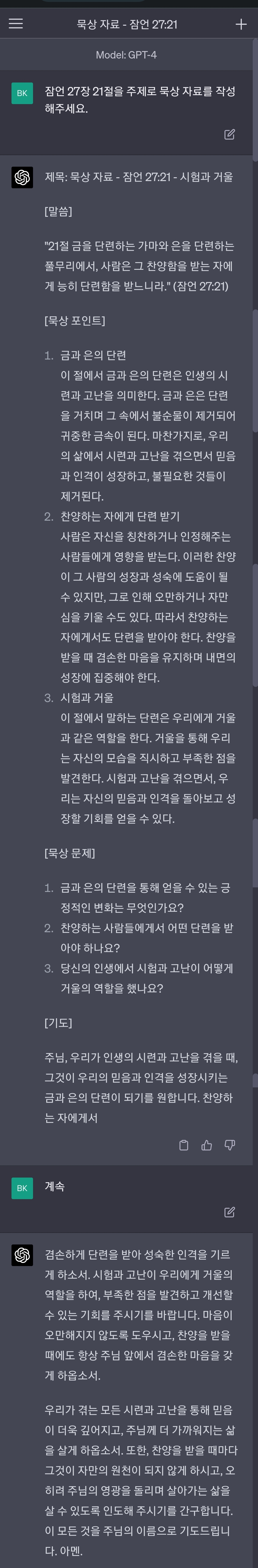 ChatGPT 활용 연습으로, 잠언 제27장 21절을 주제로 묵상 자료를 요청했습니다.
