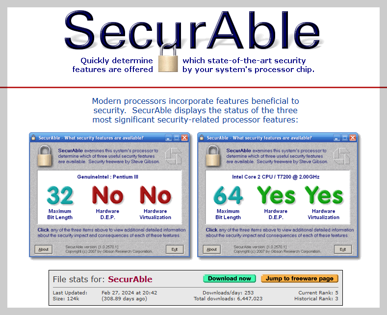 SecurAble은 Windows 기반 시스템에서 CPU의 64비트 지원 여부, 하드웨어 DEP, 가상화 기술 지원 여부를 간단히 확인할 수 있는 경량 소프트웨어입니다. 특히 하드웨어 지원 여부를 빠르게 파악하려는 사용자에게 유용하며, 설치가 필요 없는 간편한 실행형 프로그램입니다.