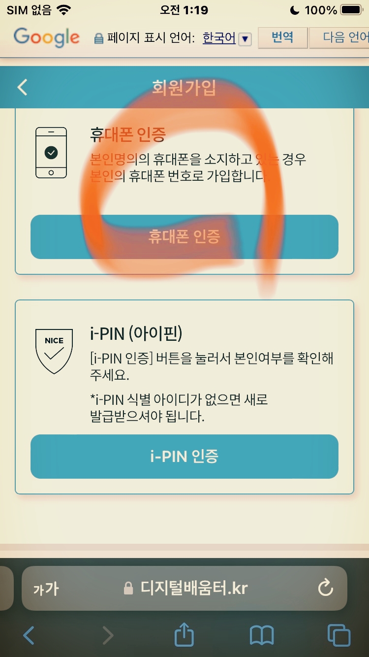 먼저 본인 확인 절차를 밟습니다. 폰이 확실한 자신의 폰인지를 확인하는 절차인데 까다롭습니다. 이용약관에 '전체동의'하고 진행합니다. '일반회원'으로 가입합니다. '휴대폰 인증'을 탭 합니다. 화면이 가려질 수 있습니다.