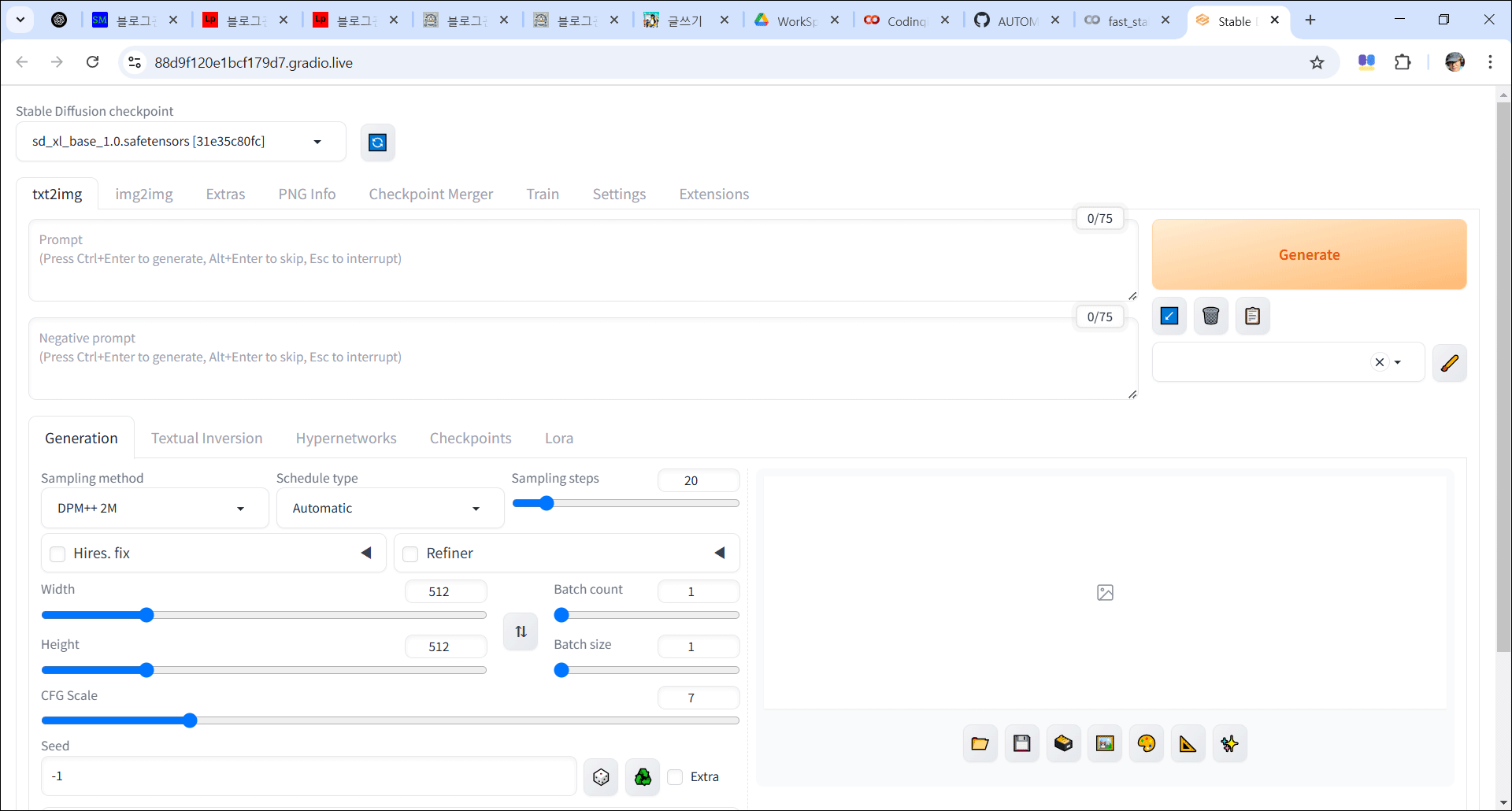 이제 프롬프트를 입력하고, 위의 설정을 조정한 후 "Generate" 버튼을 눌러 원하는 AI 이미지를 생성하면 됩니다! 🎨