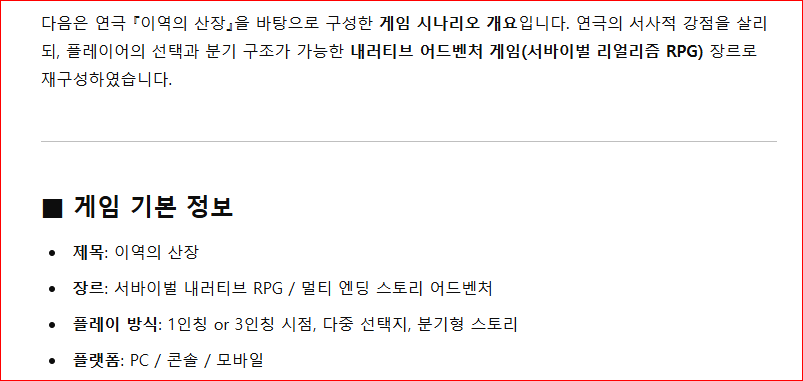 연극 대본을 제공하고 '게임 시나리오 개요' 작성을 요구했습니다. 챗봇은 내 의도를 살려 다음과 같이 서두를 열면서 시나리오 개요를 만들었습니다.