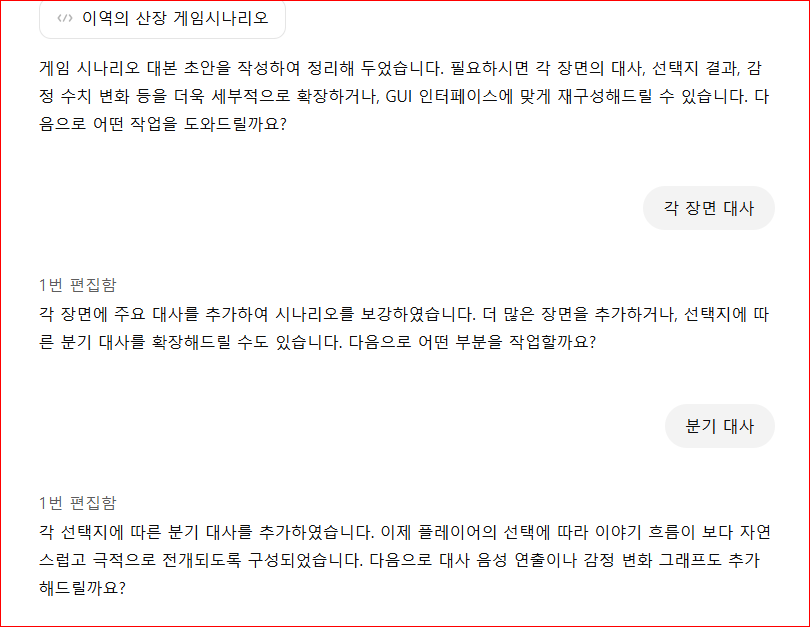 각 장면의 대사와 선택지 결과, 감정 수치 변화 등을 세부적으로 확장하는 과정을 추천하고 거기에 따라 장면 대사와 분기 대사를 추가했습니다.