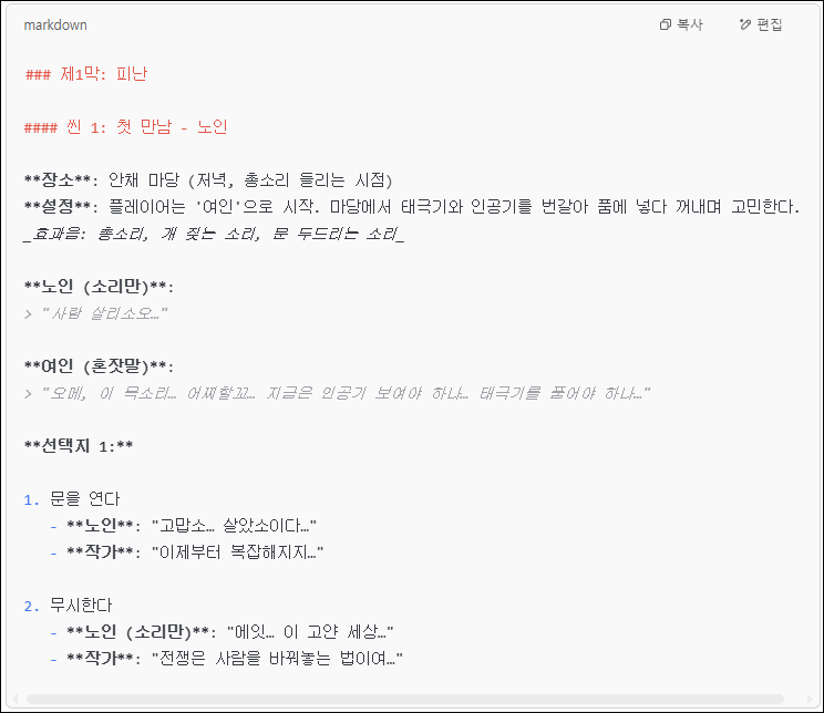 다음은 게임 시나리오를 챗봇이 마크다운 언어로 작성된 소스입니다.