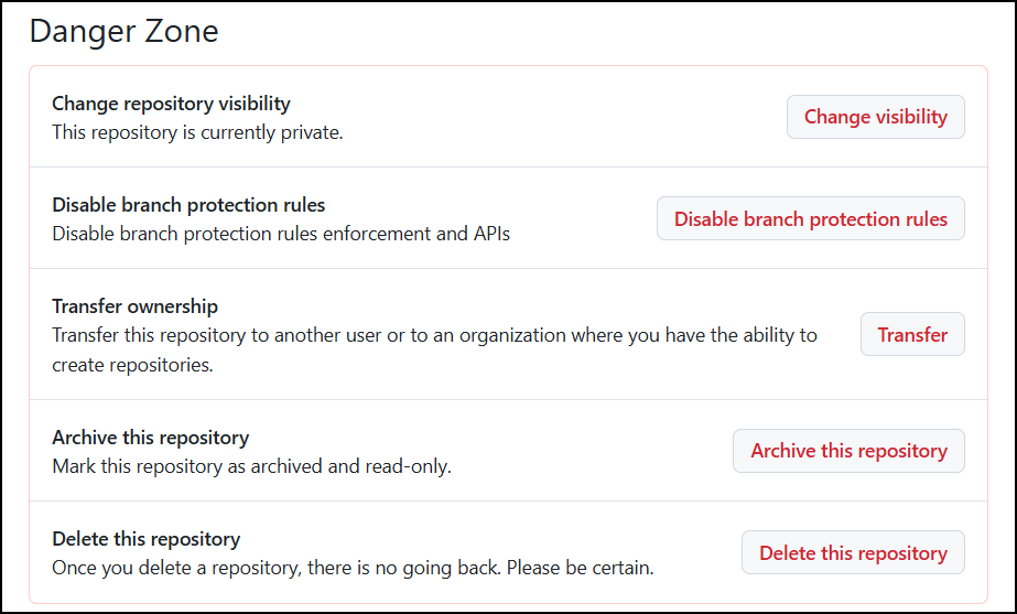 화면 아래쪽에 빨간색으로 표시된 Danger Zone 섹션이 나옵니다. - "Delete this repository" 버튼 클릭