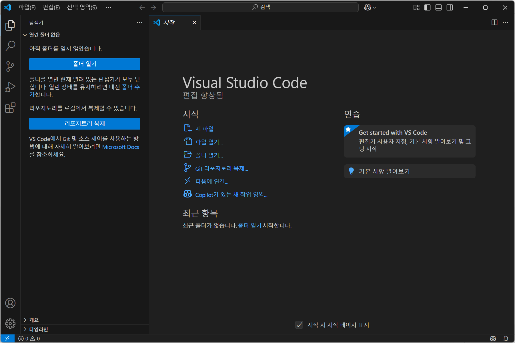 - 다시 실행된 VSCode 화면이 한글로 표시되면 성공입니다.