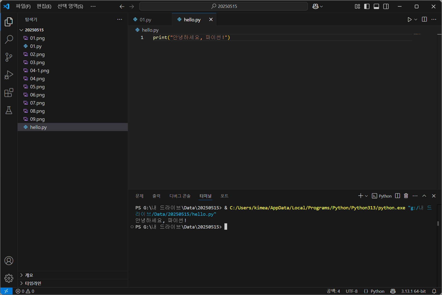 터미널에 "안녕하세요, 파이썬!"이 출력되면 성공입니다.