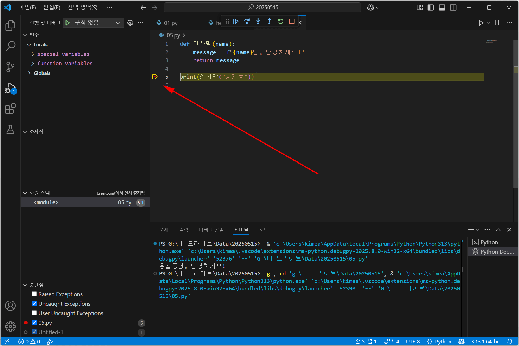 디버깅은 코드를 한 줄씩 실행하면서 변수 상태를 확인할 수 있는 기능입니다.
