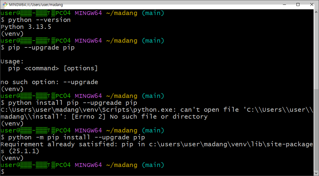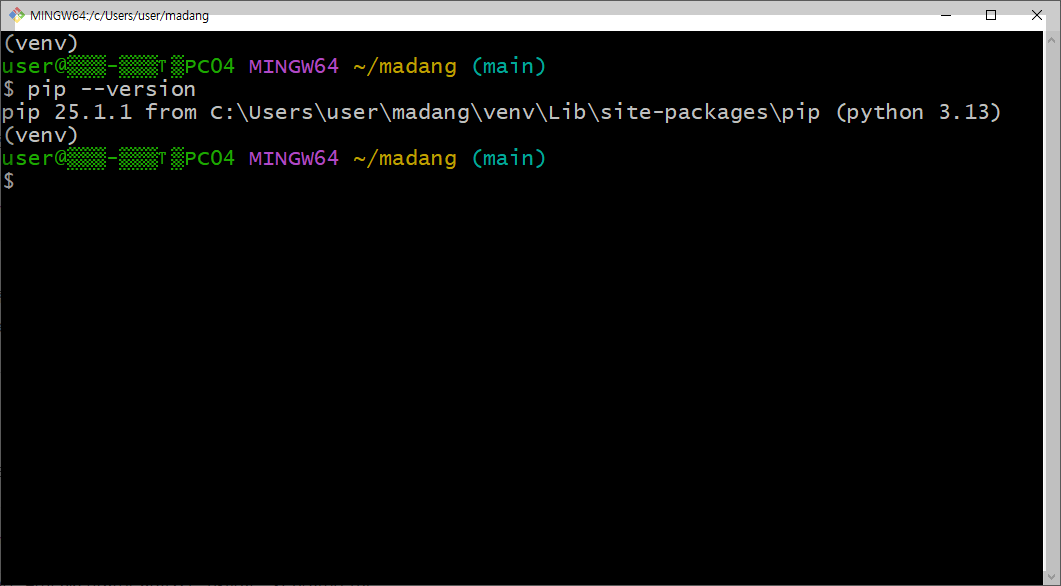 - python -m pip: 현재 활성화된 Python 가상환경에 내장된 pip를 실행하라는 뜻입니다.