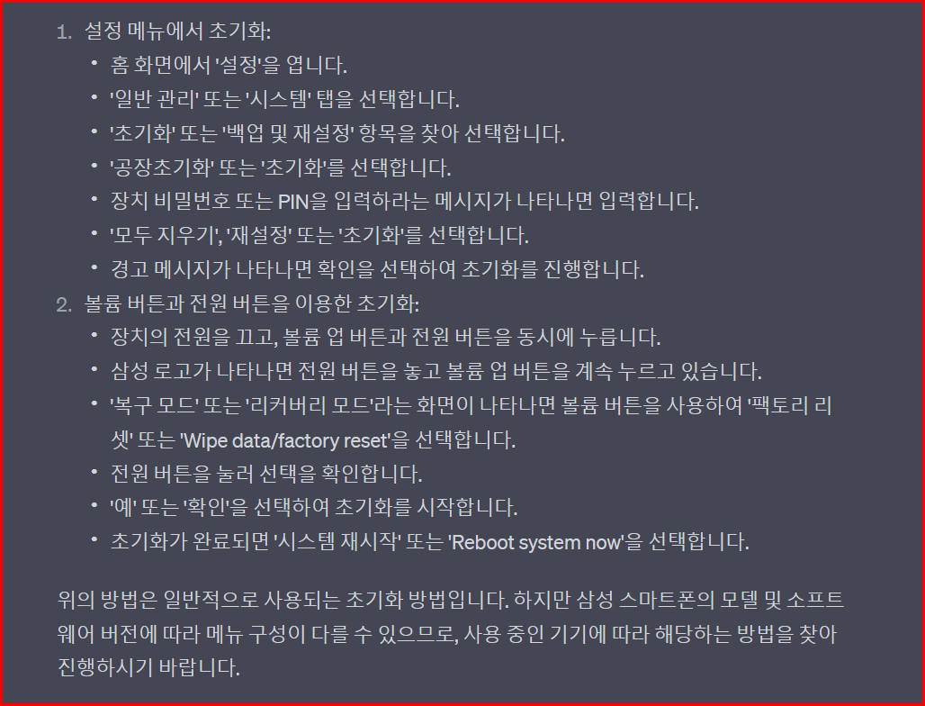 친구가 자신의 옛 폰을 교육용으로 사용하려는데 어떻게 하느냐고 묻습니다. '초기화'를 시켜 사용하면 좋겠다고 했습니다. 방법을 모른다고 합니다. 챗봇에 알아보라 했습니다.