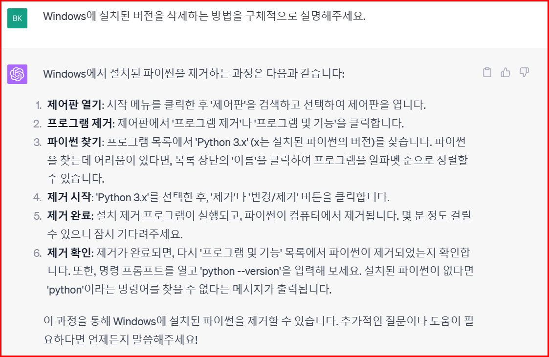 컴퓨터에 설치된 파이썬을 삭제하려고 ChatGPT(이하 '챗봇')에게 물었습니다.