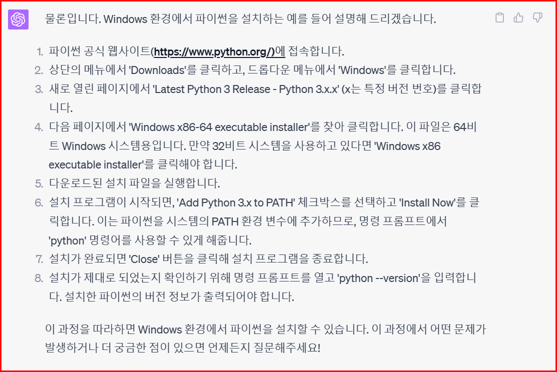 오늘은 그동안 설치된 파이썬을 제거하고 최신 버전을 내려받아 내 컴퓨터에 설치했습니다. 앞으로 챗봇을 이용하여 파이썬 공부를 진행하도록 하겠습니다.