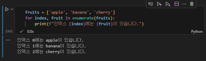 print(f"인덱스 {index}에는 {fruit}이 있습니다.")