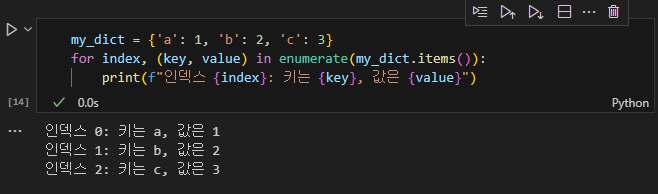 딕셔너리의 키와 값을 순회하면서 인덱스를 함께 사용할 수 있습니다.