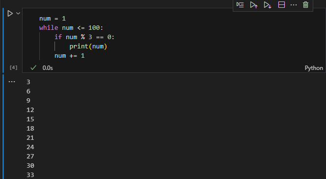 1부터 100까지의 숫자 중에서 3의 배수만 출력하는 예제입니다.