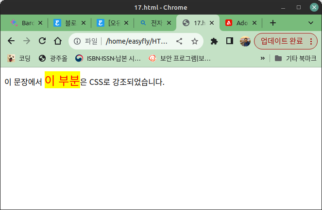 <p>이 문장에서 <span class="highlight">이 부분</span>은 CSS로 강조되었습니다.</p>