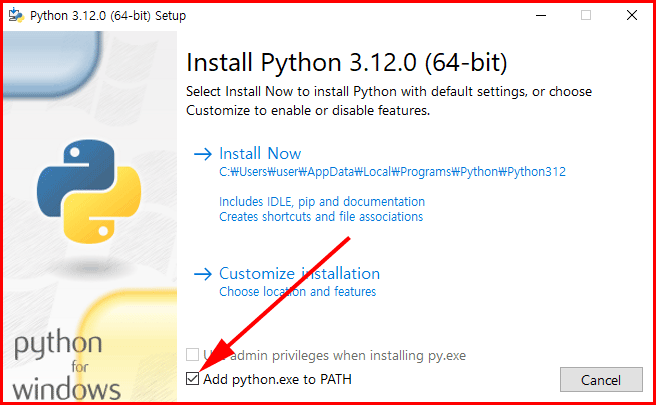 - 설치 초기 화면에서 'Install Now'를 선택하기 전에 반드시 아래에 있는 'Add Python [버전] to PATH' 옵션을 체크합니다. 이 옵션은 파이썬을 시스템의 환경 변수 PATH에 자동으로 추가해 줍니다.