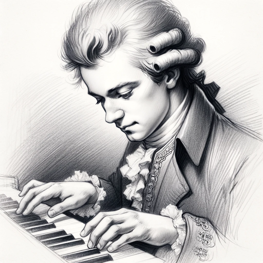 모차르트도 그렸습니다. 같은 프롬프트를 사용했는데 피아노를 연주하는 모습을 그렸네요.