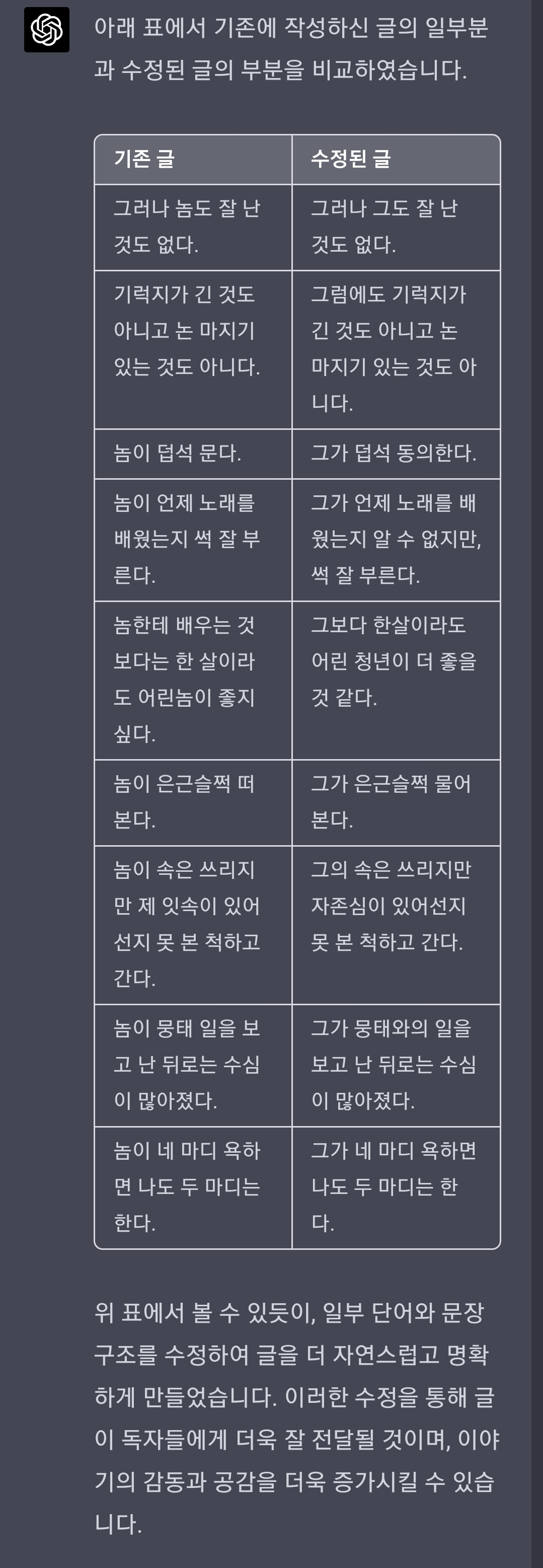 ChatGPT가 수정 작성한 내용이 어떤 것인지 구분이 어려워 기존 글과 수정 글을 비교해서 표 작성을 해 달라고 부탁했다. 다음은 ChatGPT가 제시한 표이다.