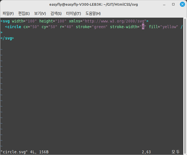이 코드는 중심이 (50, 50)이고 반지름이 40인 원을 만들며, 녹색 테두리와 노란색 채우기를 가집니다. 이 파일을 .svg 확장자로 저장하면 SVG 파일이 됩니다.