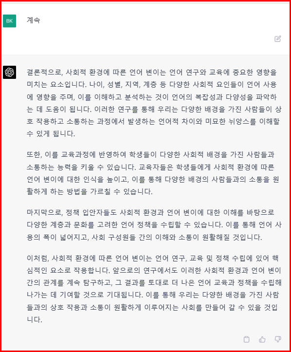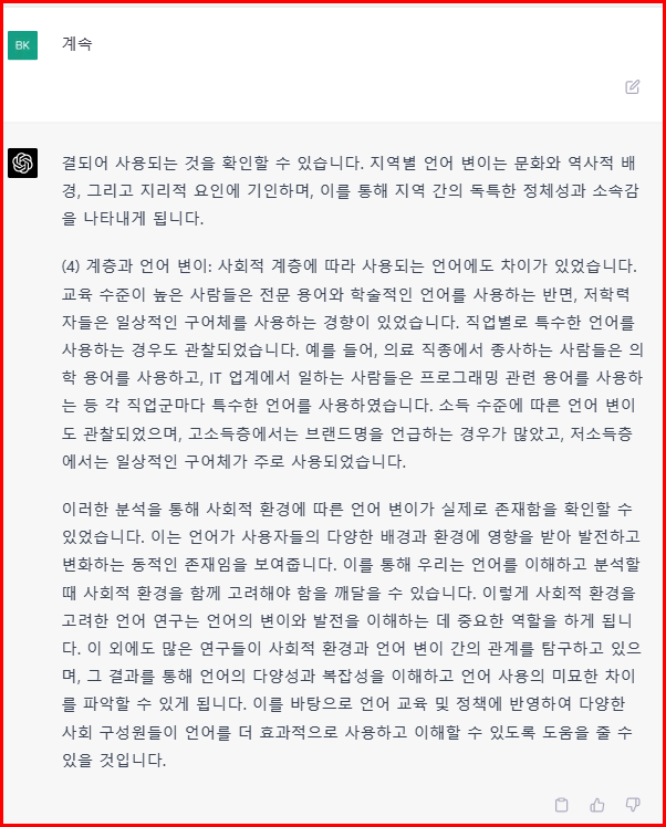 다음은 답변 내용입니다. 답변이 나오다가 중간에 끊어집니다. 대체로 1000자 정도 진술하고 끊어지는 것 같습니다. 중간에 끊기면 '계속' 또는 'Continue'를 입력하면 이어서 작성됩니다.