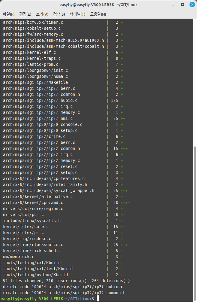 예를 들어, arch/mips/sgi-ip27/ip27-hubio.c 파일은 185줄이 삭제되었음을 나타냅니다(이것은 파일이 삭제된 것일 수도 있음). arch/mips/sgi-ip32/ip32-common.h 파일은 새로 생성되었으며 15줄이 추가되었습니다.