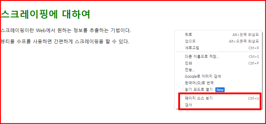 웹 문서의 소스를 보는 방법은 다음 두 가지가 있습니다. 웹 페이지에서 마우스 우클릭을 하면 팝업 메뉴 아래쪽에 '페이지 소스 보기'와 '검사' 항목이 있습니다.