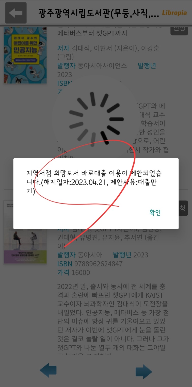 그 제도를 잘 활용하면 신간도서를 빨리 접할 수 있습니다. 물론 필요 서적 여부는 도서관에서 필터링합니다. 제가 도서 신청을 했다가 규칙을 범하게 됐습니다. 사실은 저도 모르게 빚어진 일이긴 하지만...... 여하튼 저는 페널티를 먹었습니다. '대출 이용 제한'. 이유는 '대출 만기' 즉, 대출 날짜를 지키지 않았다는 얘기입니다.