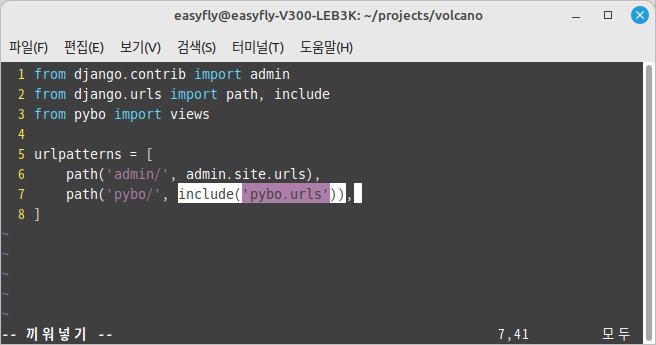 pybo 앱 디렉터리에 urls.py 파일을 생성합니다. 이 파일에서 장고 웹 프레임워크에서 URL 패턴을 정의하고 있습니다.파일의 내용은 다음과 같습니다.